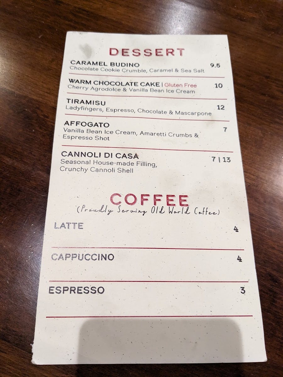 The restaurant's menu is a delightful canvas painted with the bold, robust flavors of Italy. Start your culinary journey with their renowned Warm Chocolate Cake, paired beautifully with cherry agrodolce and vanilla bean ice cream—a dessert that promises to satisfy every sweet craving for just $12. Another crowd-pleaser is the Tiramisu, showcasing delicate ladyfingers soaked in espresso and layered with chocolate and mascarpone, perfectly priced at $14.40.