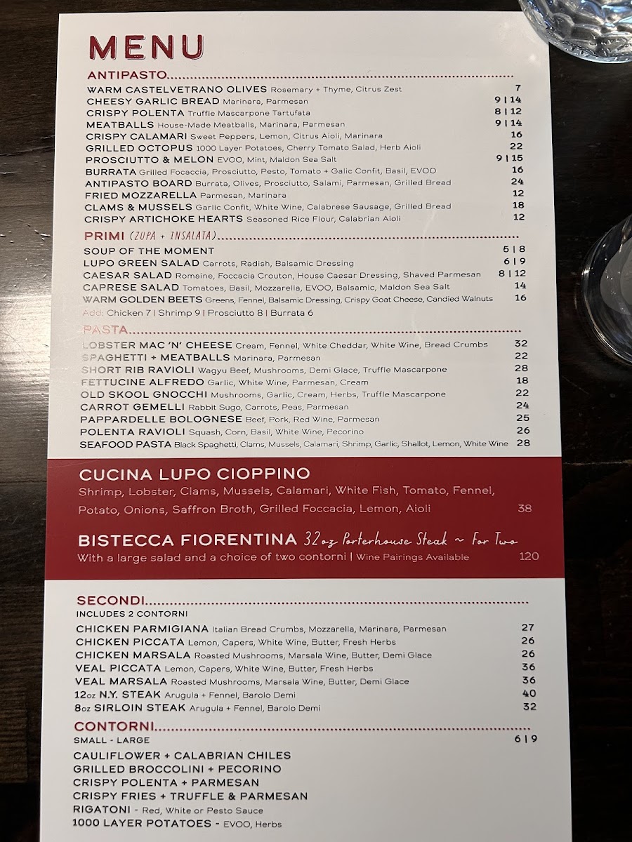 Cucina Lupo's specialty lies in its thoughtfully crafted entrees. The Pappardelle Bolognese ($30.00) features tender pasta enveloped in a rich sauce made from a blend of beef, pork, and red wine that feels like a warm embrace on a chilly evening. Alternatively, the Short Rib Ravioli ($33.60), filled with sumptuous wagyu beef and finished with a decadent truffle mascarpone, is an elevated take on a classic dish that leaves a lasting impression.